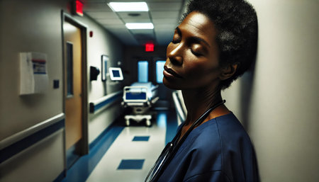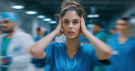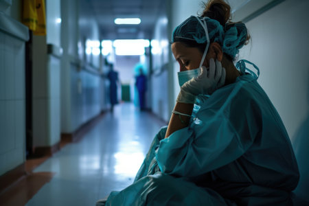 Female nurse in blue scrubs holding head in emergency corridor illustrating healthcare burnout hospital stress and need for mental health support