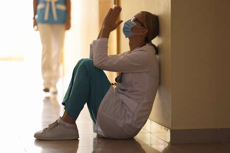Doctor in white coat and protective mask sit on floor in hospital corridor and pray. Woman ask for help and strength in klinien to god.