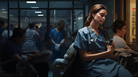 A woman in a blue scrubs is leaning against a wall in a hospital hallway. She is exhausted and in need of a break