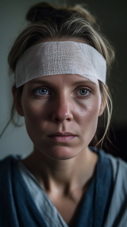 Indoor shot of sick woman victim of reckless driving feels discomfort in stomach broken nose and leg uses mobility aid looks sadly at camera comes to see surgeon recovers : Generative AI