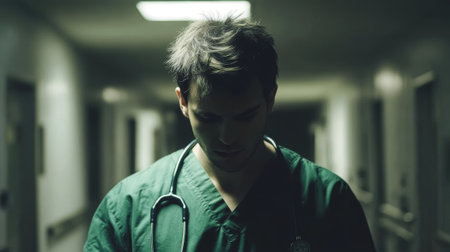 A focused medical professional in scrubs and mask displays deep concentration in a dimly lit environment, symbolizing dedication and care in healthcare settings.