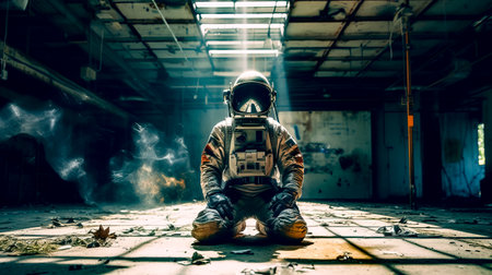 Man in space suit sitting on the floor with camera in his hand. Generative AI.