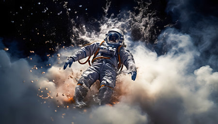 A man in a spacesuit is floating in space. The image is a representation of the vastness of space and the unknown. The man's presence in the image is a reminder of humanity's curiosity