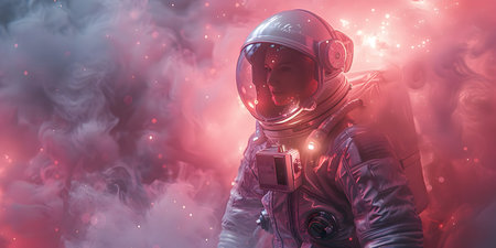 An astronaut floats weightlessly amidst a vibrant, ethereal space environment filled with cosmic debris. The image features a cool-toned astronaut against a backdrop of swirling magenta and pink nebulae. Suitable for illustrating themes of exploration and innovation, this artwork could be used in various commercial applications.
