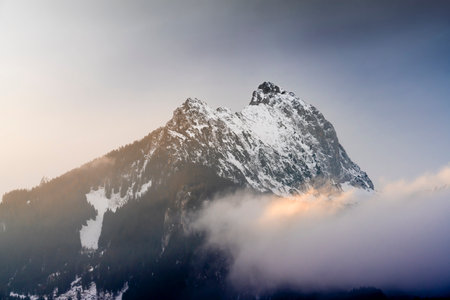 swaths of colored clouds pass by the Gehrenspitz mountain peak in winter at sunset