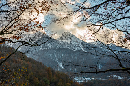 View of landscape through autumn forest to the high mountains in the snow. Transition from autumn to winter.