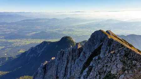 Panoramic view on the haze shrouded valley from the way to Mittagskogel in Austrian Alps. Clear and sunny day. Endless mountain chains. Outdoor activity. Barren top of the mountains, lush lower parts