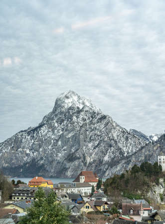 Small Austrian village by Traunsee lake with snow mountain Traunstein
