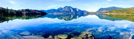 Panoramic view of alpine lake with reflection of mountains in water