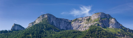 Mountain and alpine hill landscape mountains and rocks peaks panorama with green fields forest fir trees nature and blue sky in the Eastern Alps Salzburg Region Austria.
