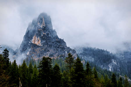 Mountain landscape with fog and clouds. Dolomites, Italy