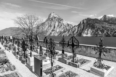 Traunkirchen, Austria - April 22, 2015: old cemetery at the church yard in Traunkichen, Austria. The abbey was already in existance by 632 A.D.