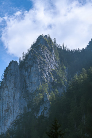Scenic view on mount Rote Wand near Mixnitz in Styria, Austria. Morning landscape of alpine meadow and rock formation in the valley of Grazer Bergland in Styria, Austria. Overcast