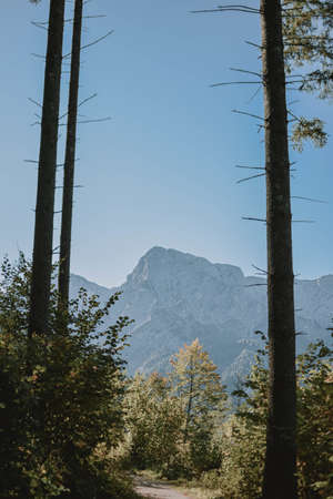 View to top mountain Traunstein in Austria Alps landscape