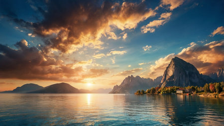 Golden light painting rocky peaks and calm reflective water.