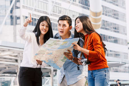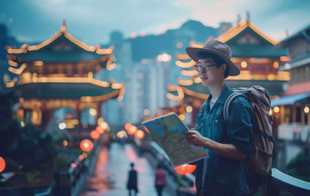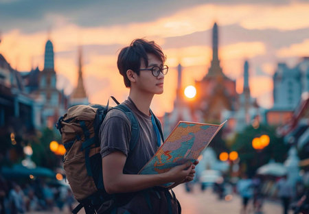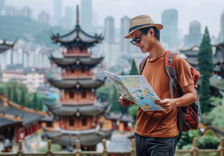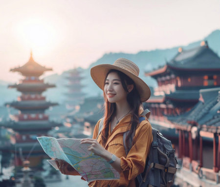 Asia tourist looking at map. Beautiful tourist attractions. generative ai