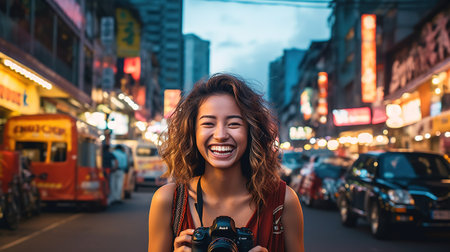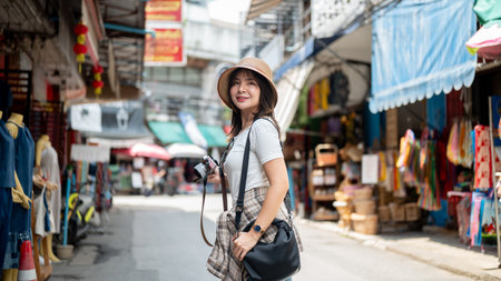 Portrait of young beautiful woman with camera explore street in Bangkok, Thailand