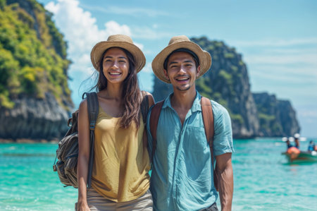 Portrait of happy young couple on vacation at tropical island in Thailand