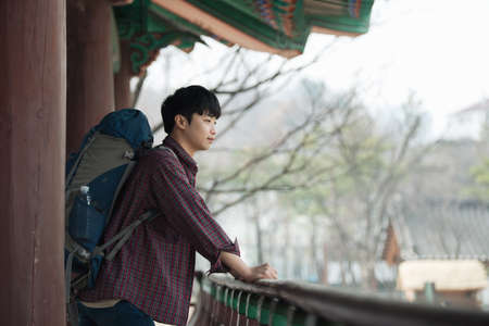 A young man doing a backpacking trip in a Korean traditional house.