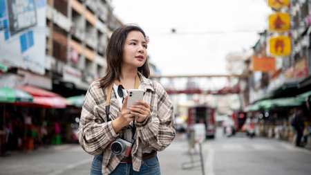 An Asian female tourist enjoys taking photos of the night view of Yaowarat Road or Chinatown in Bangkok, Thailand.