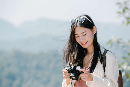 Asian woman traveler using camera. Asia summer tourism concept