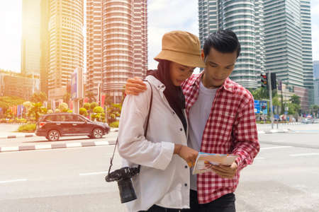 Travel Concept, Tourist couple at Kuala Lumpur smiling looking at the map discussing