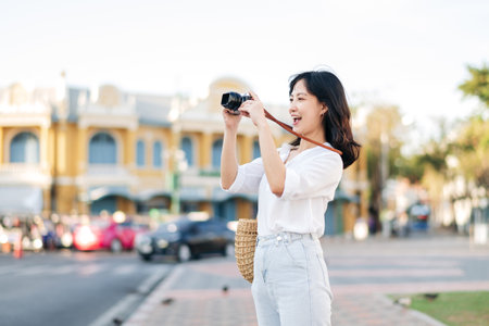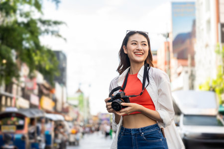 Happy asian youth woman with camera travels street city trip on leisure weekend. Young hipster female tourist sightseeing summer urban Bangkok destination. Asia summer tourism concept.