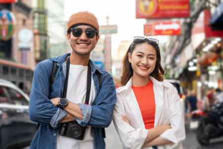 Young Asian couples enjoy and have fun outdoor lifestyle together in street market on summer holiday vacation in Bangkok, Thailand. Happy man and woman feeling surprised about how beautiful the city
