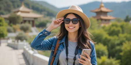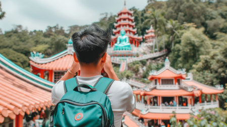 Traveler Capturing Majestic Asian Temple Amidst Lush Greenery