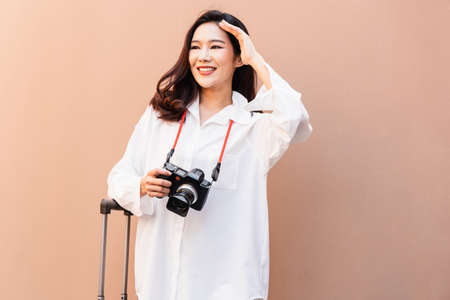 Asian woman posing in trendy look Taking photos while travel on summer day. Portrait of a smiling brunette women natural makeup wear fashion clothes . female traveler drag the suitcase