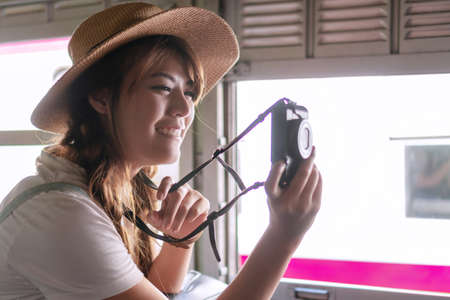 Portrait of an Asian woman smiling and take photo at the train station. Tourism concept