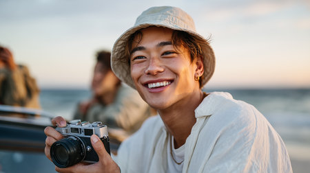Beautiful Asian woman with group friend enjoying a vibrant travel lifestyle, exploring exotic destinations, savoring local cuisine, and immersing themselves in cultural experiences worldwide.
