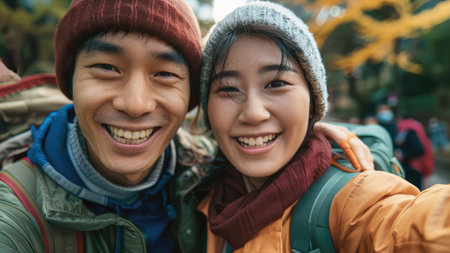 Young chinese couple wearing winter outfit taking selfie and smiling