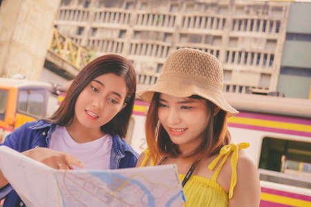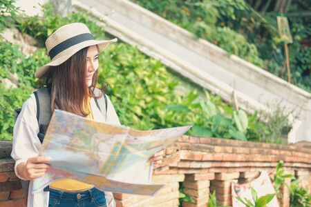 tourist girl's hold a map and looking at view Travel location Cultural and smiling on the day trip