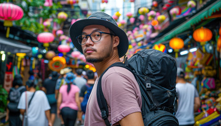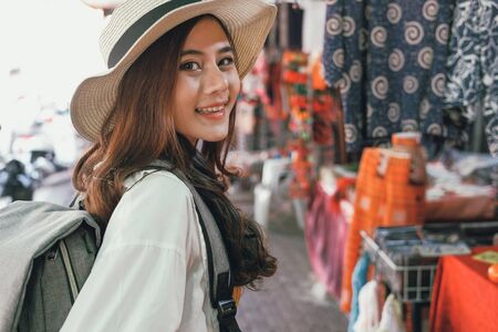 Young Asian woman traveling backpacker in Khaosan Road outdoor market in Bangkok Thailand. Happy female tourist walking in the downtown street traditional market