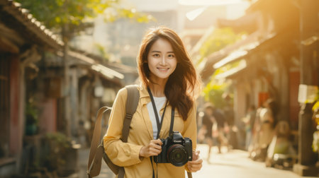 A young Asian woman with a camera wears a mustard coat, smiling on a sunny city street.