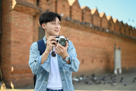 Cheerful beautiful young Asian backpacker blogger woman casual with camera take photo smiling traveling around pagoda at the old city, Lifestyle backpack tourist travel holiday concept. Point of view.