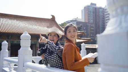 woman visitor wearing a ponytail leaning against the railing and reading a guidebook is turning around to check out while her friend notices and points into distance near taiwanese temples.