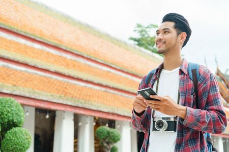 Young Asian traveling backpacker walking in temple at Bangkok Thailand. Happy tourist walking in the downtown street traditional ancient temple. Holiday vacation time tourist