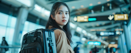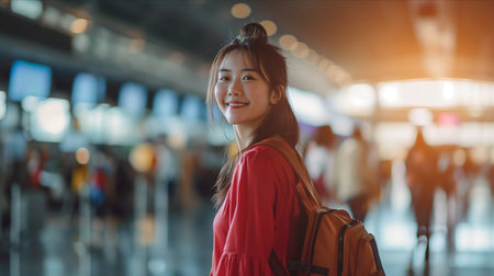 Cheerful appealing Asian female traveler with backpack at contemporary airport terminal, blank area. Idea of vacation adventure.