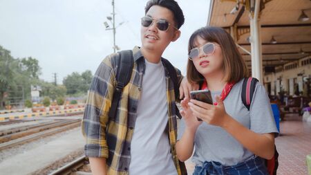 Asian backpack couple at train station, Young sweet couple tourist backpacker using mobile phone looking and direction maps on their journey in Thailand. Lifestyles couple relax and travel concept.
