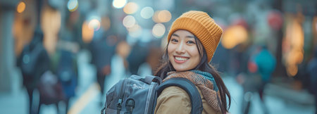 Asian woman grinning and standing on the street with her luggage and backpack