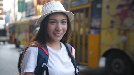 Traveler backpacker asian woman travel in Khao San road at Bangkok, Thailand. Happy young female spending holiday trip at amazing landmark and enjoy her journey in traditional city.