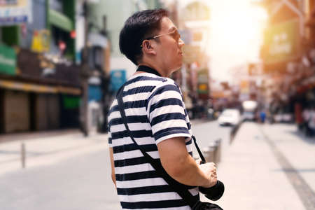 Male tourist in city with camera