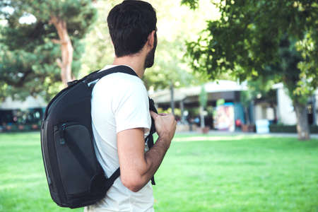 Back view of unrecognizable man in brown leather jacket wearing stylish backpack