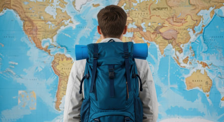 Young man with a blue backpack standing in front of a large world map, seen from behind. He appears to be contemplating or planning a global journey, symbolizing adventure and exploration.