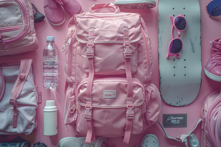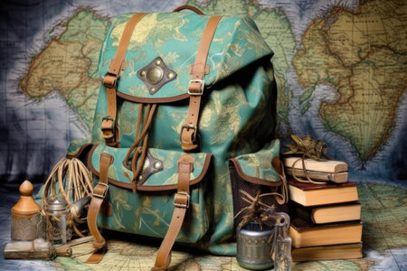 a fully packed bag sitting on a wooden table, from above. Generative AI