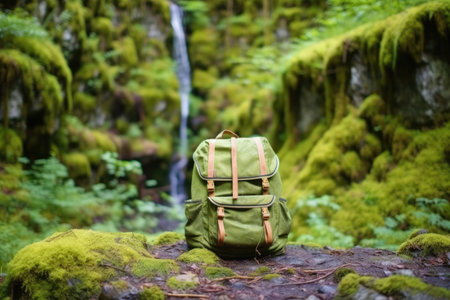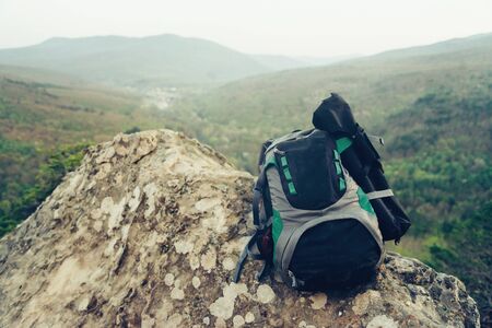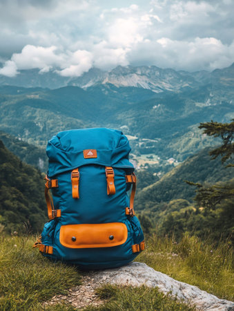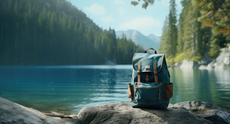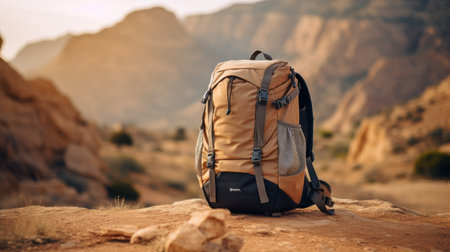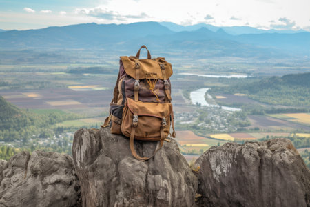 backpack on a rock overlooking a scenic valley, created with generative ai