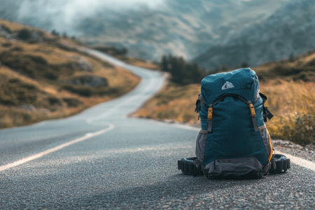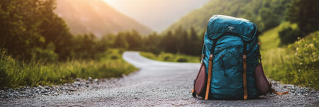 Backpack sits on a winding road, bathed in warm light, with hills and trees providing a stunning backdrop perfect for adventure seekers.
