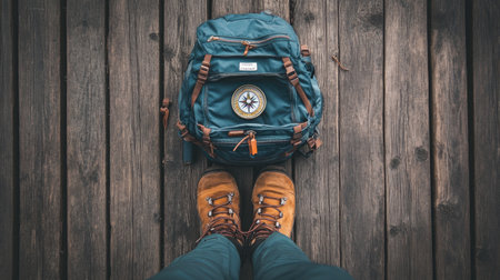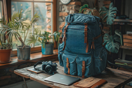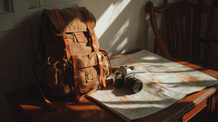 Wooden table scene with travel backpack, vintage camera, and folded map, sunlight streaming across, sense of exploration and readiness